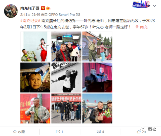 2月1日,据知名博主南充耗子哥发文透露,有南充“潘长江”美誉的著名喜剧演员叶先志因患癌医治无效,于2023年2月1日下午5点在南充病逝,享年67岁。