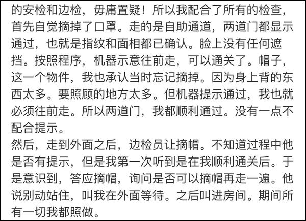 文中,她不仅反驳北京边检的通告中称其“过关不配合检查且辱骂民警”的指控,同时再次指责当事民警对自己态度及行为极其恶劣,蛮横无理仿佛是在对待“畜牲”。