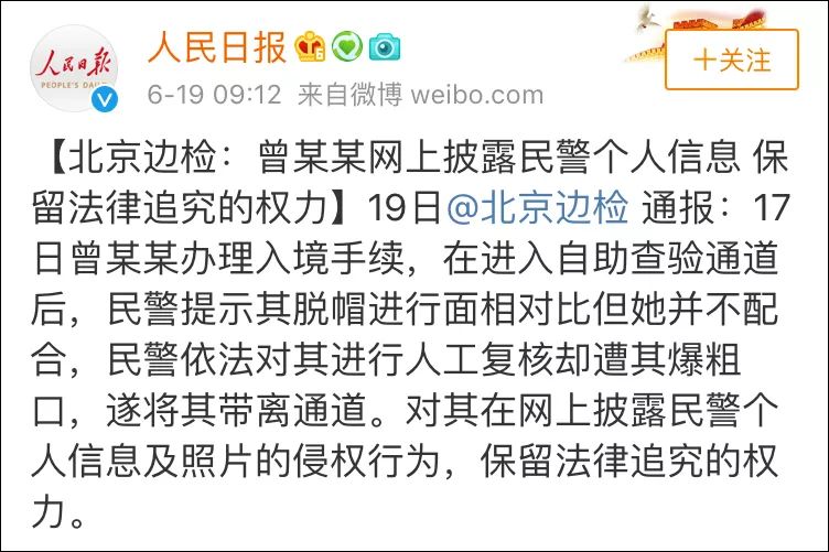 19日,@北京边检 就曾轶可连发9张照片质疑边检警察一事作出回应:对民警的身心造成严重影响的侵权行为。