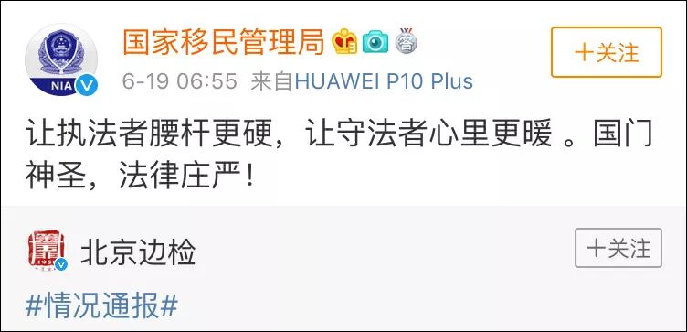 5分钟后,@国家移民管理局 率先转发了这条微博,并强硬配文:“让执法者腰杆更硬,让守法者心里更暖。国门神圣,法律庄严!”