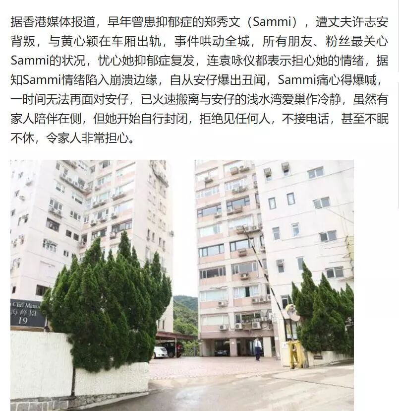 郑秀文方面,早前有港媒说她情绪崩溃已搬离爱巢。患过抑郁症的她开始自我封闭,拒绝见任何人,不接电话甚至不眠不休。