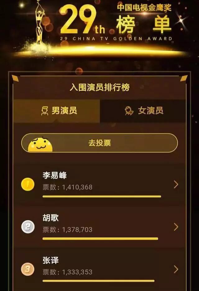 作为全国性电视艺术大奖,金鹰奖还是比较备受瞩目的,尤其在最具人气男女演员的争夺上,其中,胡歌和李易峰之间票数比拼尤为激烈,始终呈胶着状态。虽然结果让人感到意外,但胡歌输得并不尴尬,最起码与李易峰票数差距不是很悬殊。