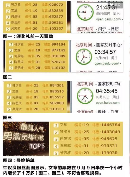 相比胡歌,14年的乔振宇和12年的钟汉良,就输得有些意外。最后阶段,他们的对手票数井喷式爆发,让人惊掉下巴。14年金鹰奖,乔振宇票数一路领先,但在最后半个小时,很突兀地就被超越。早前领先排名第二的张嘉译十几万票,最后竟被反超30万。当时有分析认为,张嘉译的演技精湛是不假,但其观众群是上年龄的,对网络投票不感兴趣。而票选人气王,应该是喜欢追剧的广大的年轻粉丝。于是粉丝认为其中有诈。与此类似,还有2012年金鹰奖。刚开始,钟汉良票数也是无人能及,没想到在短短几个小时文章票数疯涨,最后一个小时反超钟汉良6万票。这两种结果,让乔振宇和钟汉良都很惊讶。