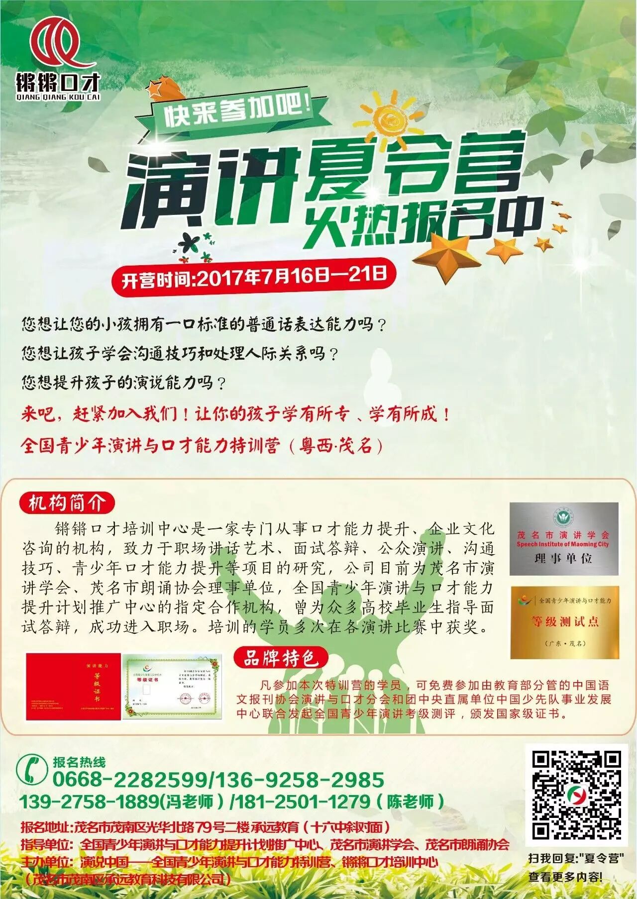 打电话到演说中国—全国青少年演讲与口才能力特训营(粤西·茂名)给黄老师,0668-2282599