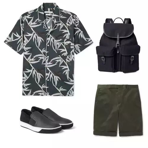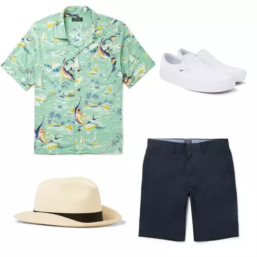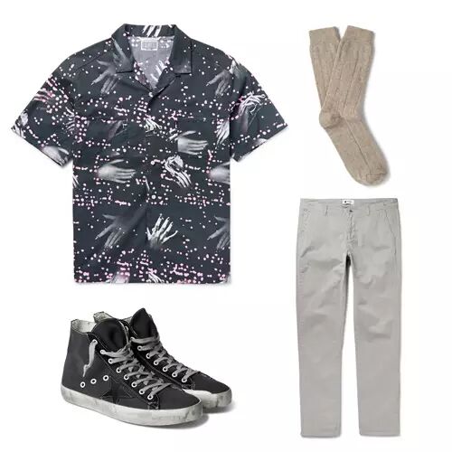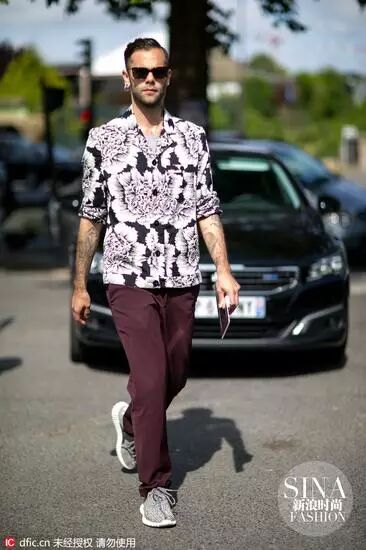 首先要说,也是印花衬衫最基本的穿法就是,在穿这种有复杂印花的衬衫时一定要选择搭配简单的裤子,并且最好是深色系,这样才不会形成头重脚轻的感觉。而且在选择鞋子的时候,要么是深色,比如黑色或是棕色,要么是选择和衣服相同颜色的鞋子,这样才不会把自己穿成一个花蝴蝶。