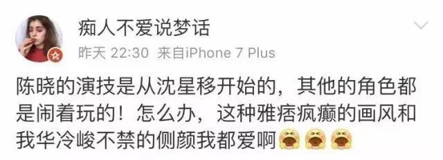 因为“原来,陈晓的演技是从沈星移开始的,其他角色都是闹着玩的。”陈晓其实一直都是流浪小生里演技过硬的一个。如今再翻看陈晓以往的那些影视剧作品,包括于正出品系列,也会发现弹幕上一水儿的“幡然醒悟”……