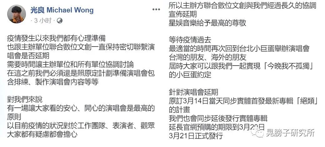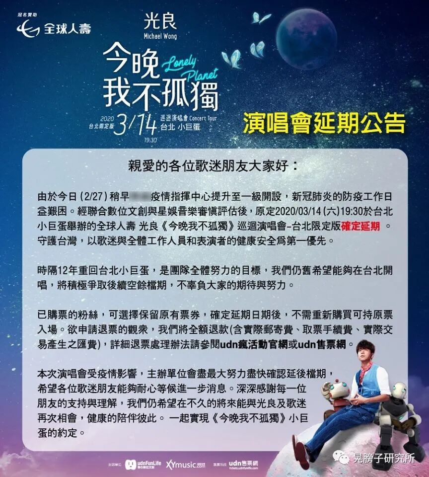 受疫情影响,主办单位决定延后演出,表示购票歌迷可以保留原票券,等新的演出时间确定后,持原票入场。