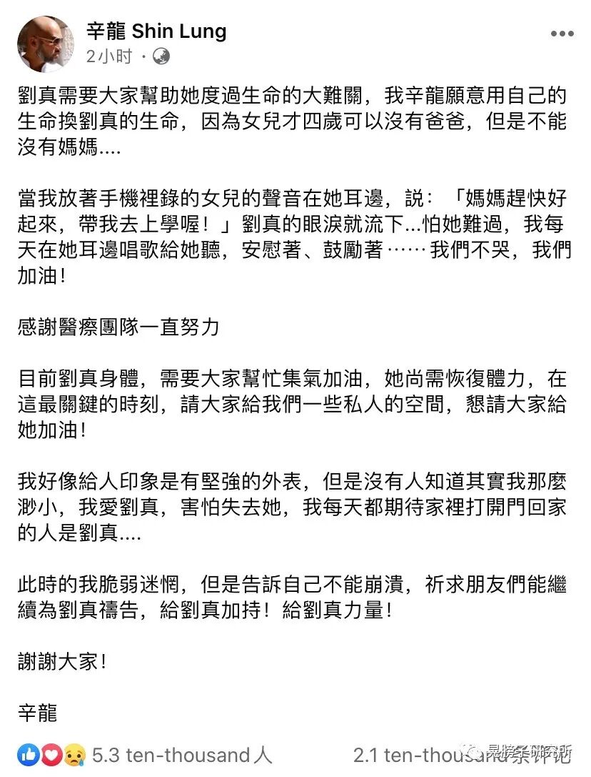 “我辛龙愿意用自己的生命换刘真的生命,因为女儿才四岁可以没有爸爸,但不是不能没有妈妈...当我放着手机里录的女儿的声音在她耳边,刘真的眼泪就留下...”