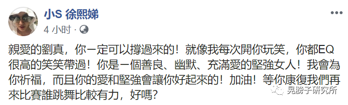 如今,小S也第一时间送上自己的祝福:“加油!等你康复我们再来比赛谁跳舞比较有力,好吗?”