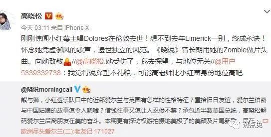 高晓松因为《晓说》与桃乐丝揭晓友谊,凌晨发文缅怀:去爱尔兰Limerick海边探望养伤的小红莓The Cranberries主唱Dolores,吉他手Noel也在,仨人愉快聊起许多过去和未来。Dolores的背伤基本好了,她希望11月能来中国巡回。她很喜欢中国,说中国给她的感觉像一只猫。呵呵呵。Limerick是我眼里爱尔兰最漂亮的城市,其次是贝尔法斯特、都柏林和Galway。没曾想那一见终成诀别。