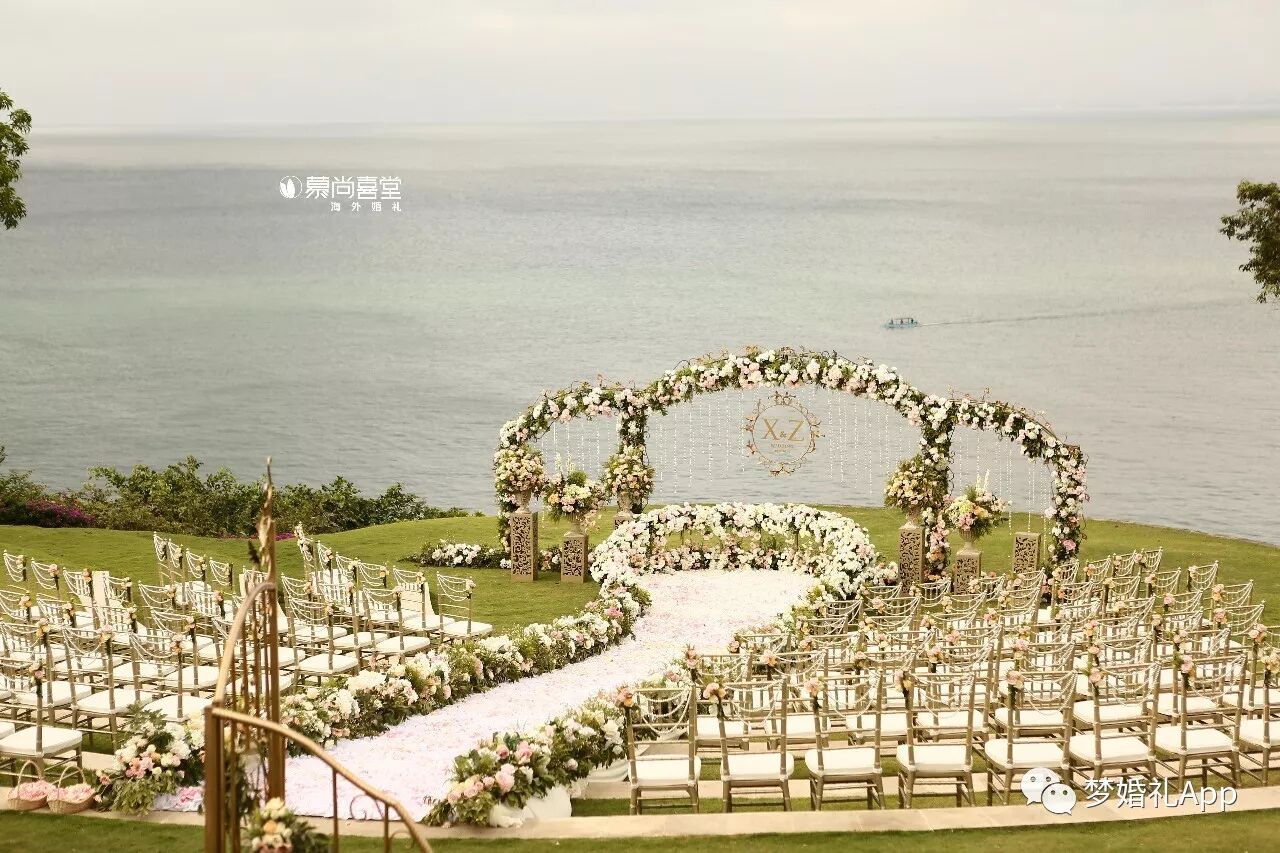 这样的草坪婚礼场地,青翠宽阔的草坪寓意新人相识相恋八年的基础,缤纷花海的效果是美好爱情的展现,面对的白云大海将是新人无限精彩的未来。