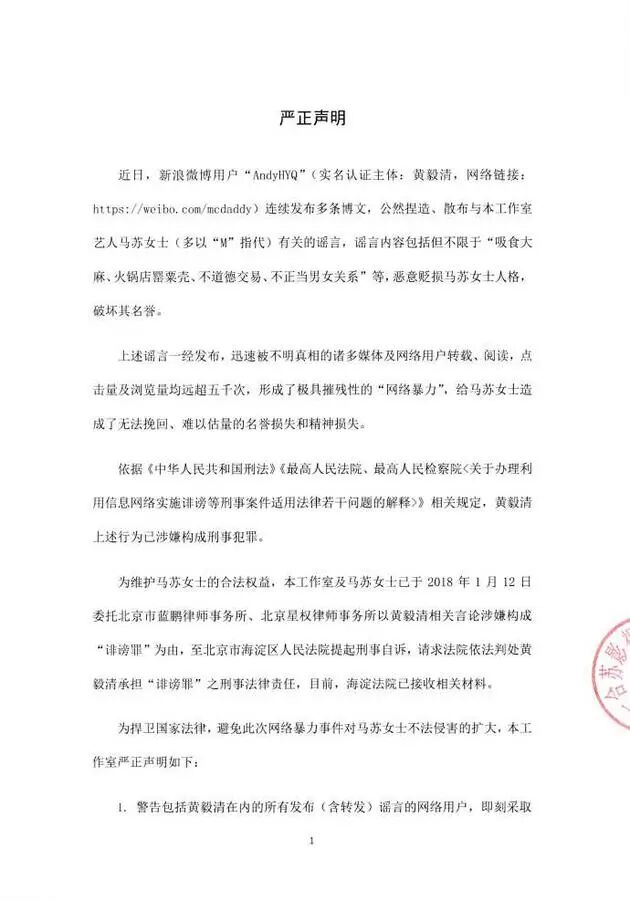 1月12日,马苏工作室官方微博发布了一则严正声明。声明中,马苏以微博用户“AndyHYQ”(黄毅清)涉嫌构成“诽谤罪”为由向北京市海淀区人民法院提起刑事诉讼,并称造谣者恶意贬损马苏人格及名誉,恶劣程度已构成刑事犯罪,将根据违法程度采用一切法律手段维护合法权益。