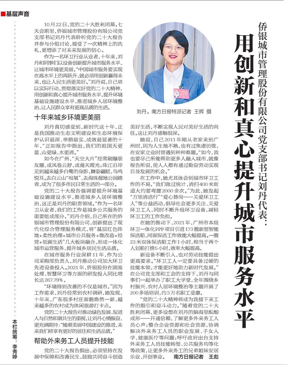 作为一名代表广东奋战在最基层的城市服务界、环卫界、民营企业界的共产党员,作为一名肩负9600多万名党员的信任重托、承载14亿多人民的殷切期待的党代表,刘丹的奋斗事迹、代表心声以及她服务的城市管理行业,受到人民日报、中央电视台、南方日报、广州日报等权威媒体的采访聚焦报道,一起看看。