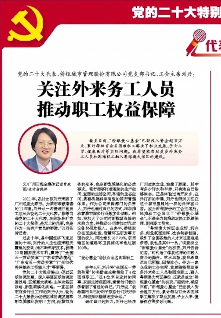 正是体验过离开家乡,在外打拼的辛酸,刘丹也特别关注在这个城市里跟她一样的外来奋斗者。成为侨银股份的工会主席后,她推动工会设立了“侨银爱心基金”,不遗余力地推动农民工权益保障、困难职工帮扶。