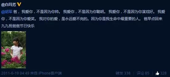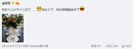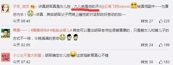 小妹翻看胡军和胡军妻子的微博,在他们很少提到私生活的部分,而从少有的几条,也能看出来他们一家人的爱意满满。都说贝克汉姆的小七是世界上最幸福的小孩,但是小妹觉得,只要是被爸爸妈妈宠爱的孩子都是最幸福的。不用身处名门,只要有父母的那份爱,就足以撑起孩子的那一片天。最后小妹小说,康总不要哭泣哦,你以后是要当的大侠,加油小男子汉!