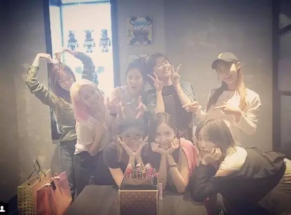 韩国女团少女时代成员为林允儿和Sunny一同庆生,少女时代8名成员难得聚齐。