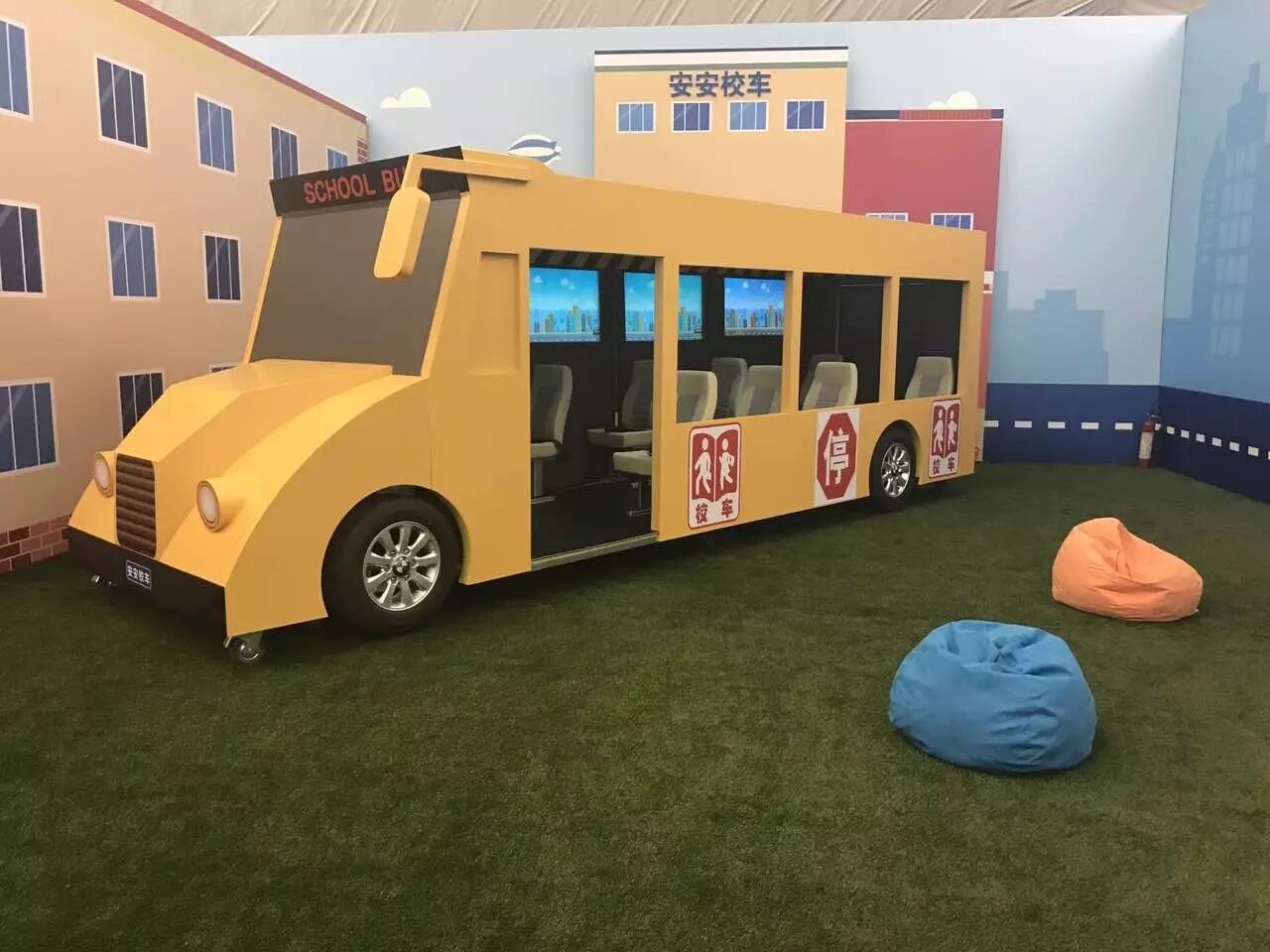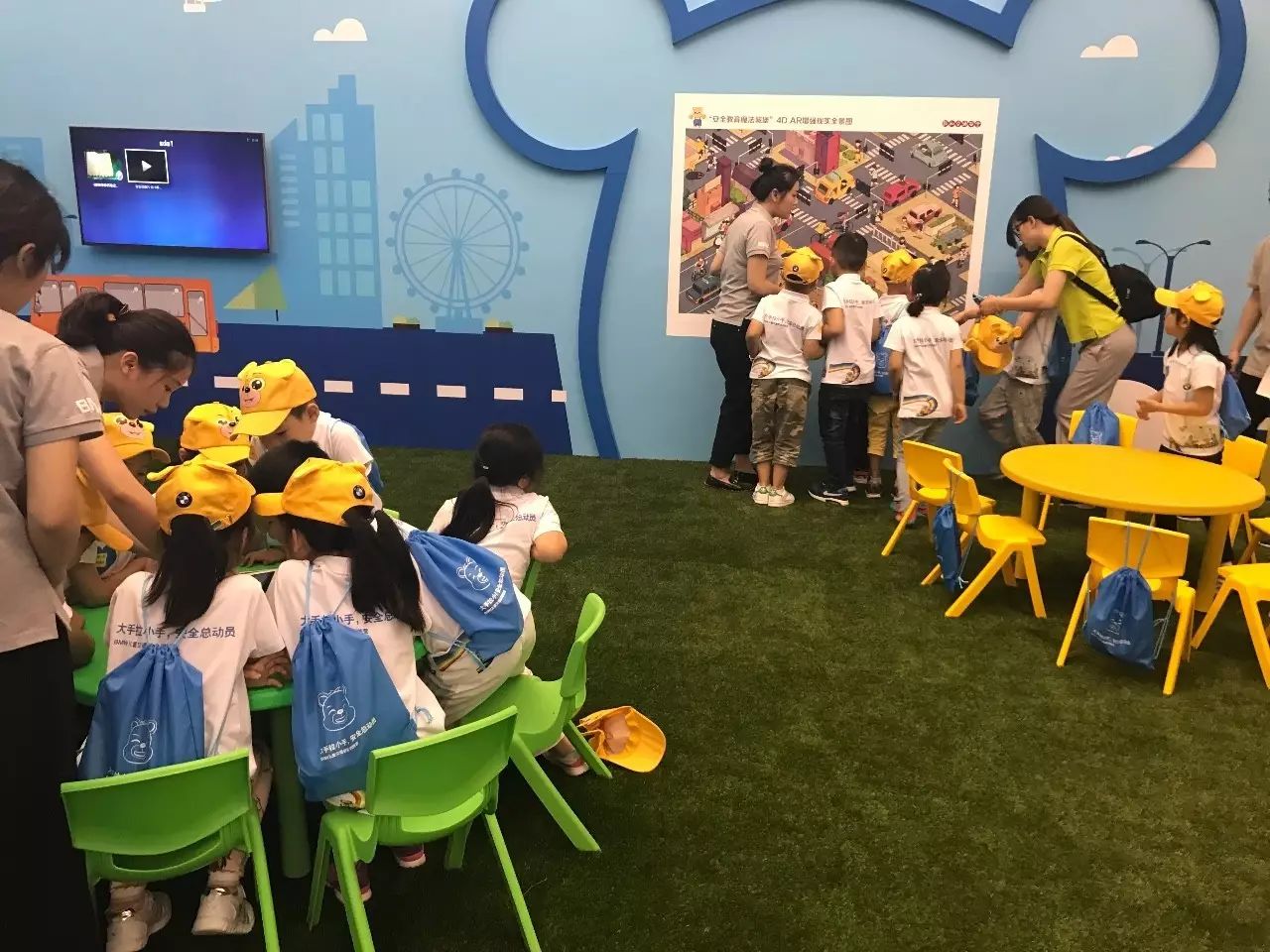 在真实的校车环境中,孩子们在一边玩乐的同时,一边跟着演示学习着自救知识,交通安全常识:上车就系好安全带,安全锤的使用.....