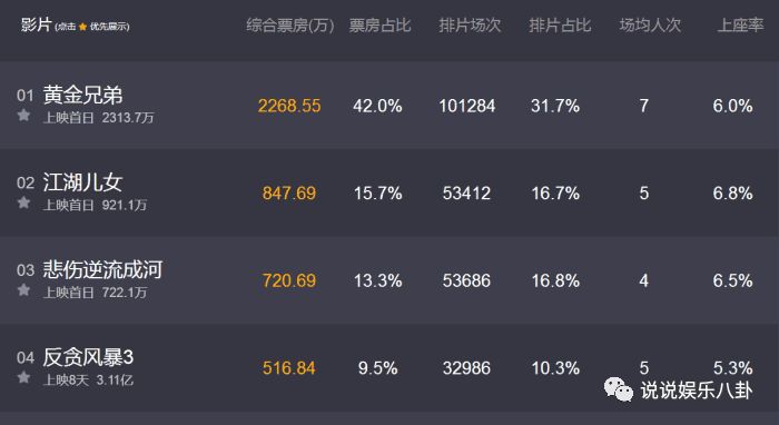 今天有3部大片刚上映就来了个开门红,坐上单日票房前三位;第一位《黄金兄弟》已经拿下2200万的票房;第二《江湖儿女》也拿下了将近900万的票房;第三位《悲伤逆流成河》也不差拿下了720多万的票房。