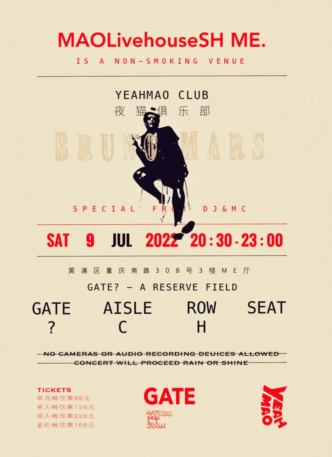活动表演形式为DJ Set,Bruno Mars本人不出席本场活动,曲目与顺序以当日演出为准!