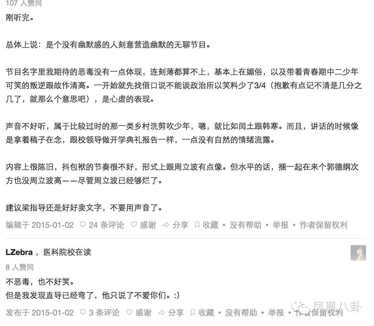 小妹和网友们一样,在梁欢的脱口秀里并没有看到毒舌,也没有看到观点,嘉宾通过哗众取宠的言论为节目博得的眼球与关注度,终究也不是一档脱口秀的立足之本。但当脱口秀的形式在国内还是一个新鲜的领域,希望以后能有更好的尝试!