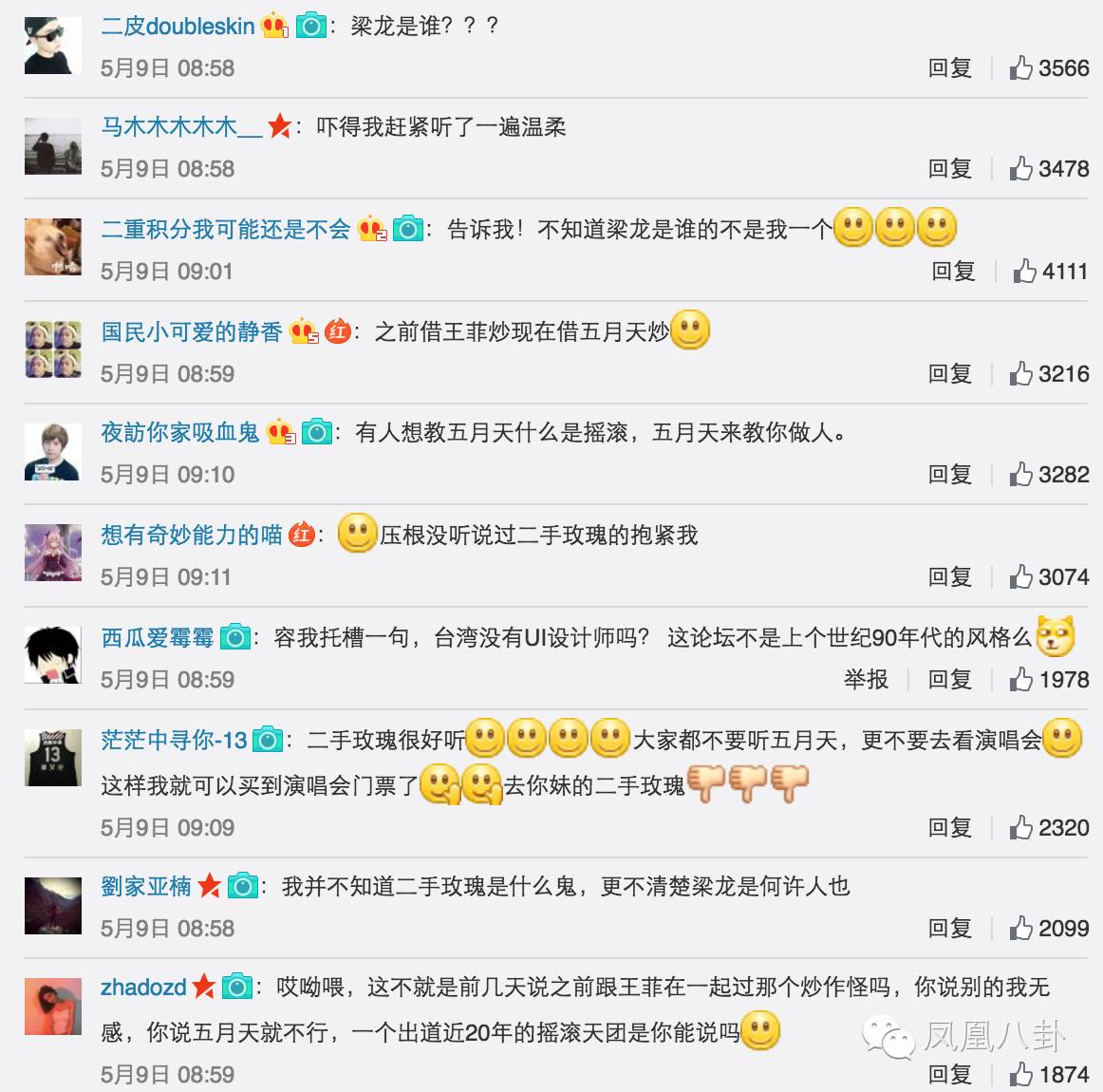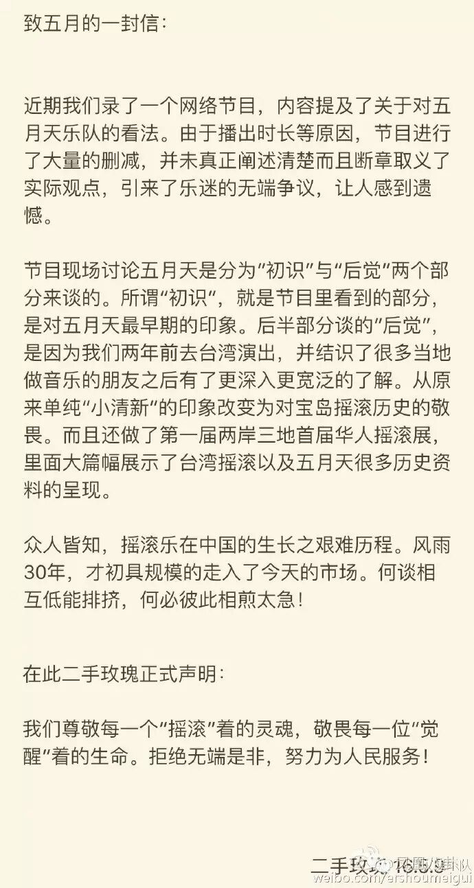台湾网站上的网友各种抨击之时,五月天的玛莎却回应说:我觉得二手玫瑰很好听,大家有机会可以试试看