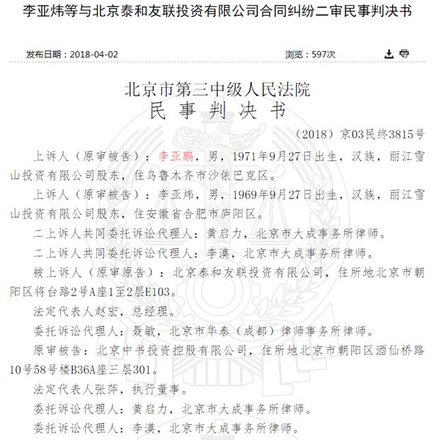 随后,在中国裁判文书网上,此案的相关信息显示,丽江雪山投资有限公司(简称丽江雪山)与北京泰和友联投资有限公司(泰和友联)的合同纠纷一案,李亚鹏与其兄李亚炜均为丽江雪山的股东。