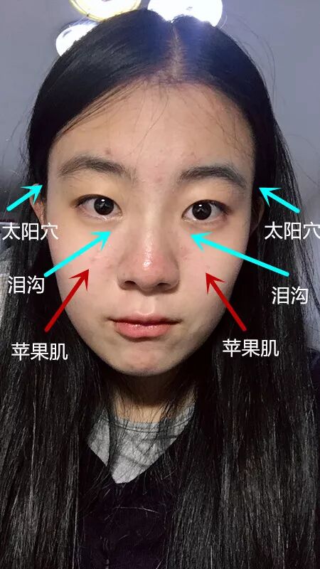 另外,妹纸的脸部缺乏立体感。太阳穴、苹果肌凹陷,而且有很明显的泪沟问题。