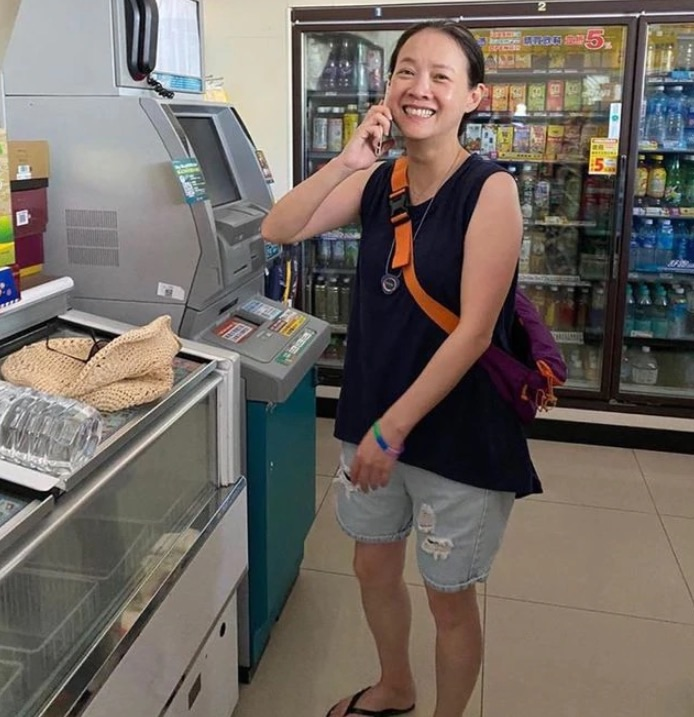 这个时候是私底下的她,可以看到脸上完全没有化妆,所以显得整个人看起来比较的真实,她整张脸长得还是比较的娇小,上半身穿了一件黑色的衣服,是无袖的设计,下面穿了一条短裤,是破洞的设计