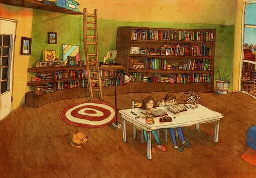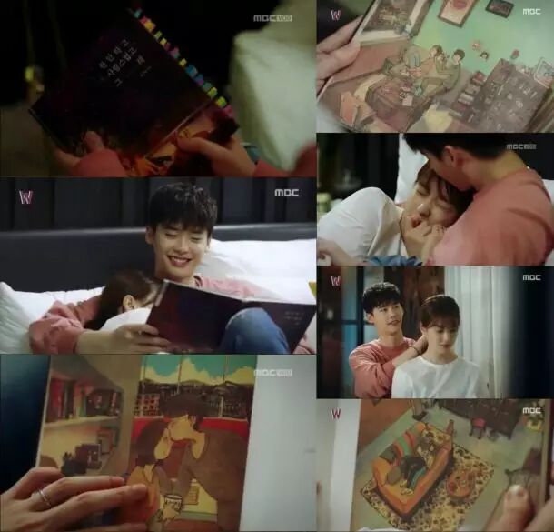 这个就是在第七集中出现的一本漫画书,它是出自韩国插画师Puuung之手的《爱‧小时光》,《W两个世界》中钟硕的很多撩妹技能都是从这里面学习的噢。Puuung将自己与爱人的生活工作画面用画笔记录下来,暖心的色彩,温馨的场景,点点滴滴都洋溢着幸福。