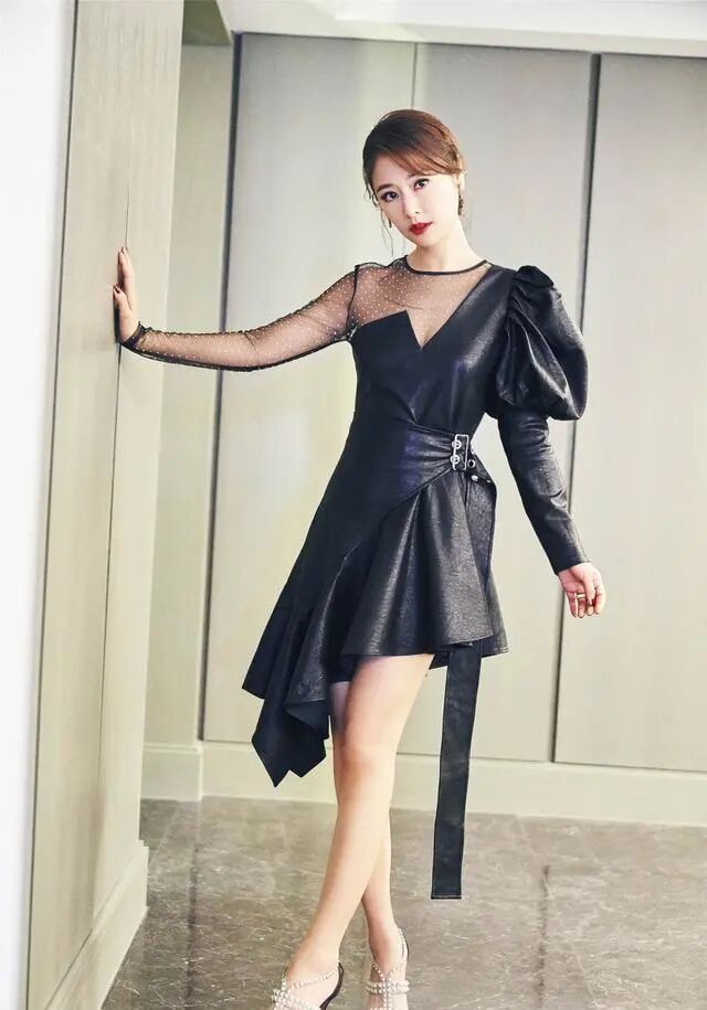 这是经常搭配使用的衣服的裁剪方法,缝合的衣服设计独特,给人不同的美感,林心如这条黑皮裙子用皮质和薄纱两种材质拼接,不同的材质不同,黑色原本就神秘性感,黑纱忽隐忽现,给予无限的想象力,裙子系在腰部,腰部线条明亮,使用不规则的裙子进行设计,非常有个性。