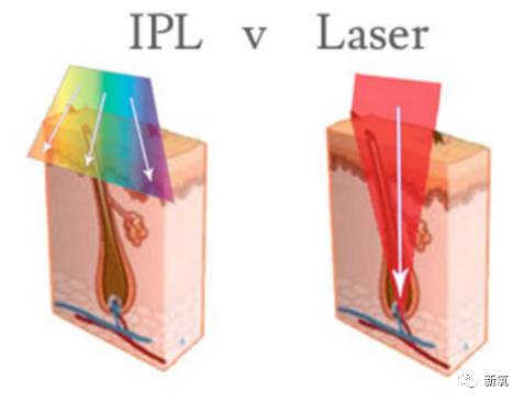 而光子是一种复合光,它由多种波长的光混合而成,一般情况下,常用范围是500nm-1200nm。你们平时听到的,强脉冲光、E光、IPL这些词其实都是光子而不是激光。(下图左边)