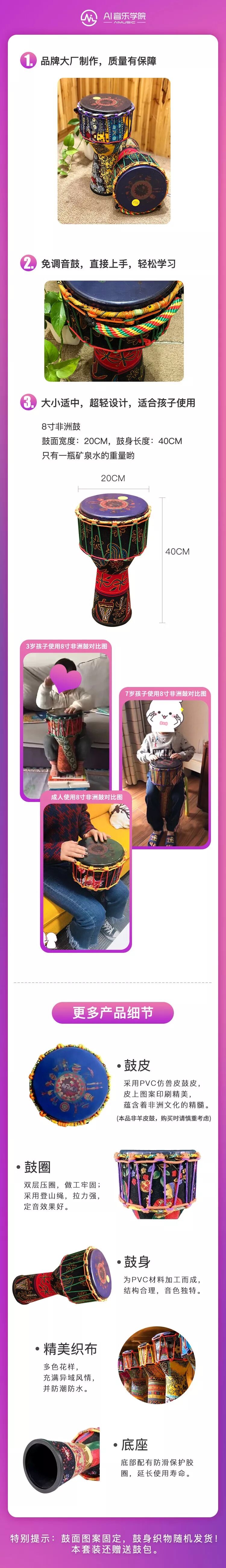 (1)鼓皮采用仿兽皮鼓皮,皮上图案印刷精美,蕴含着非洲文化的精髓,同时也能让孩子明白环保的重要性。鼓皮为免调音款,材质耐用,适合孩子入门。