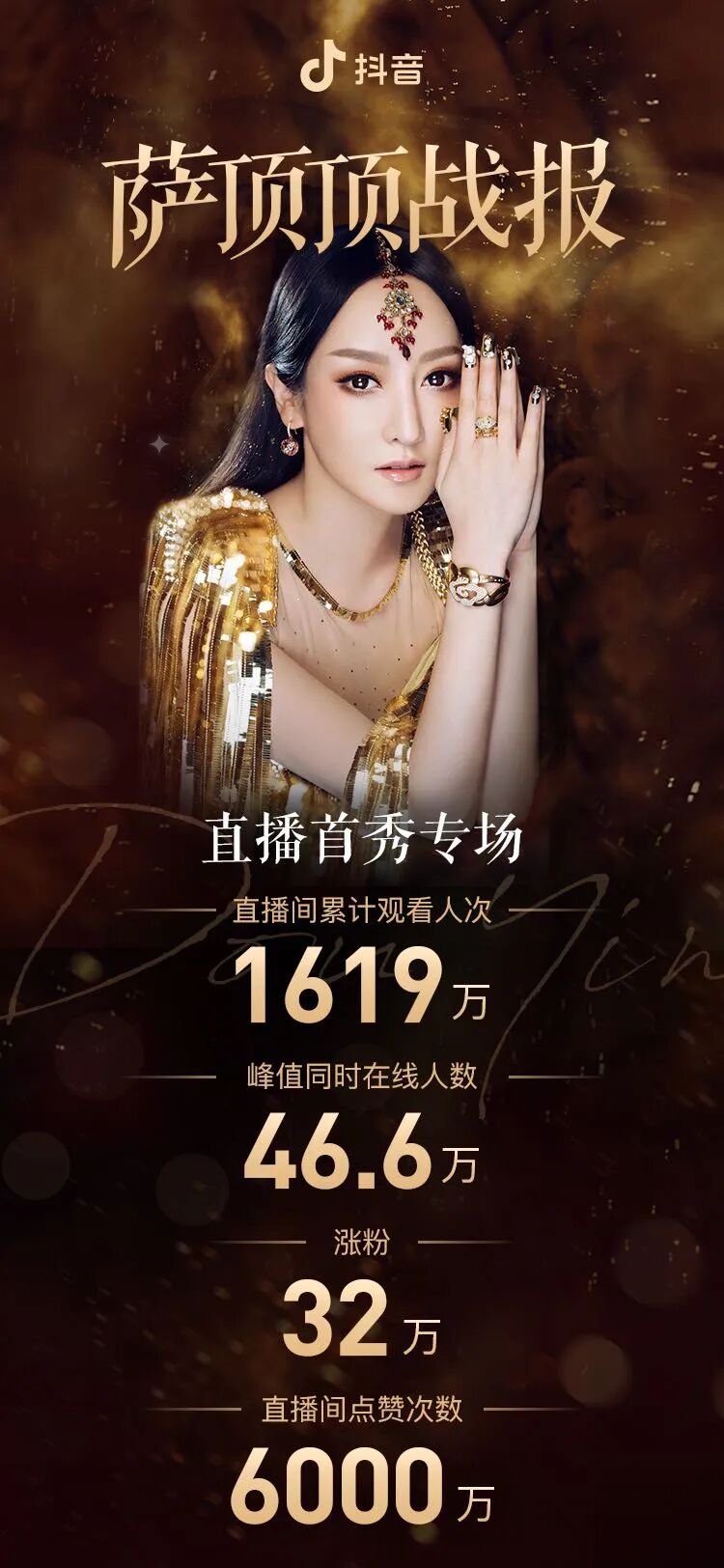 独特的嗓音结合鲜明的个人特质,萨顶顶的抖音直播首秀创下了整场累计观看人次1619万、涨粉32万、直播间点赞次数破6000万的好成绩。