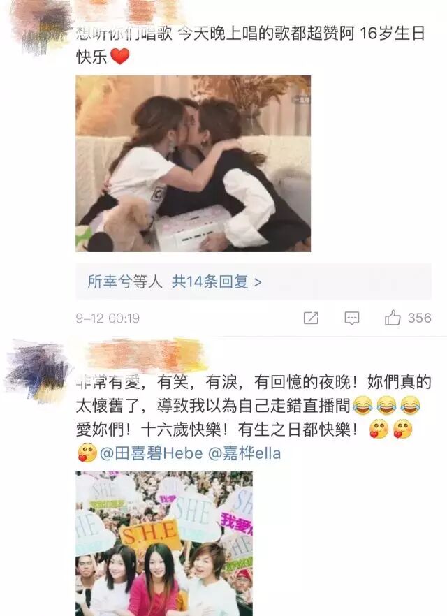 9月12号,SHE组合赛琳娜与田馥甄分别晒出一张三姐妹的合影为组合庆祝16岁庆生。