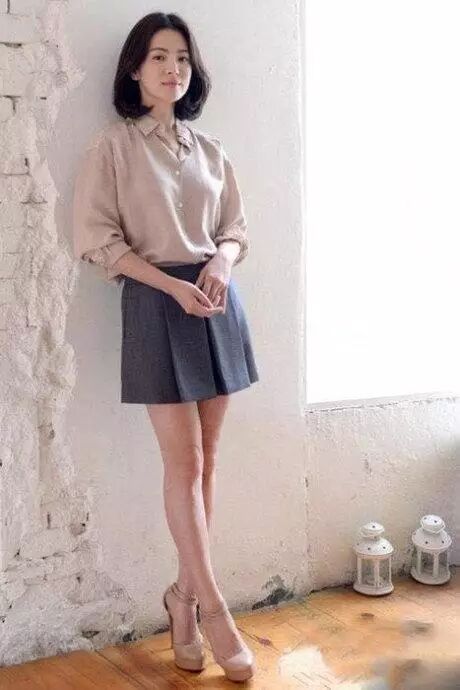 米色衬衫+深灰色a字裙+裸色高跟鞋,衬衫塞到裙子中拉长下半身比例,显高显瘦极了
