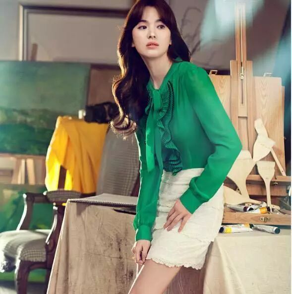 翠绿色衬衫+白色蕾丝包裙,这种长袖雪纺衫也是遮手臂粗的利器哦