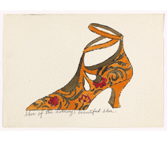 1955年,沃霍尔开始为著名的米勒时装鞋店设计广告插画。这幅鞋子广告充满简洁、黑白的水墨线条,显得优雅又充满魅力,为沃霍尔赢得了“画鞋的人”的美誉。在进行设计时,他习惯于先用墨渍线条在光面纸上作画,在颜料未干之际,再将图案压印在另一张吸水的白纸上,最终复印出颜色深浅不一、呈锯齿状的线条。通过这样的方法,他的插画图案古怪迷人且带有一种不规则、粗糙的手工质感,形成了颇为鲜明的创作风格。