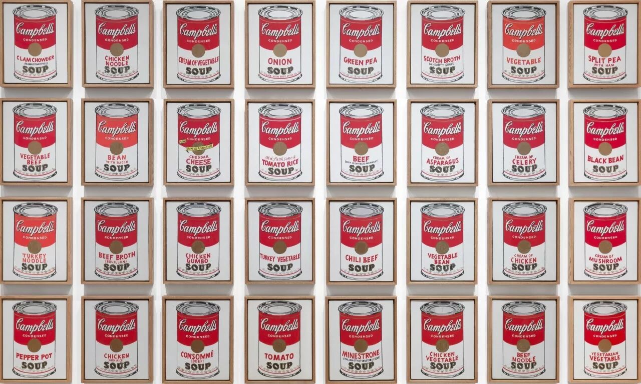 《坎贝尔汤罐头》是安迪·沃霍尔创作生涯的重要坐标,也是他在艺术界的成名作。在汤罐头系列画作中,沃霍尔将这种独特的印刷复印效果发挥到极致。他在画布上精心重构了来自杂志广告中的番茄汤罐头形象,将32个印有红色标志的罐头形象在白色背景上进行复制,依次在 3英尺高的画面上排列起来,产生了强大的视觉冲击感。对于沃霍尔来说,极易识别通俗易懂的汤罐头也可以成为艺术。他认为艺术不需要高深莫测,竭力去避免高端艺术对于作品所传达信息或内在意义的依赖。因此,沃霍尔选择了他一直为企业品牌创作的广告作品来创作艺术,拆除了艺术与广告之间的高墙。