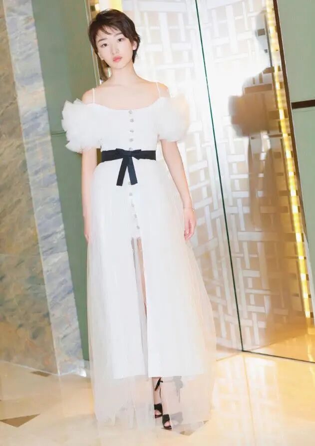 裙子表面加有一层薄纱,使得整体造型更加柔美,仿佛仙子降临凡间。这种设计不仅增添了几分小仙女的韵味,还让人感受到了周冬雨的甜美与可爱。同时,薄纱的设计也让整个穿搭更加轻盈,仿佛随着微风飘动,令人陶醉。