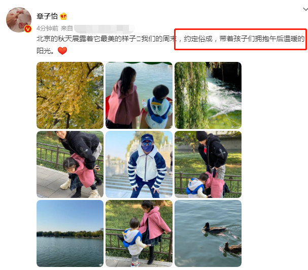 10月23日,章子怡在社交平台晒出一家四口周末去北海公园游玩的照片,并表示这个家里的约定,每个周末要带孩子拥抱阳光。