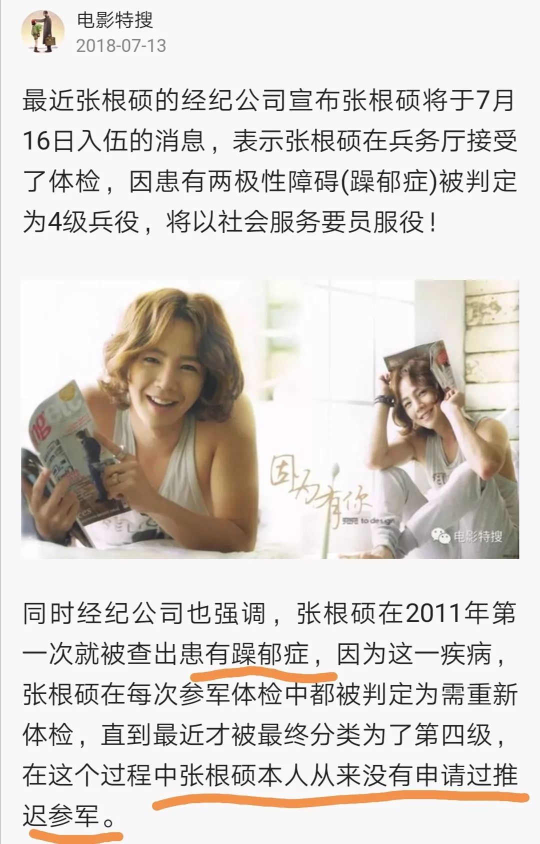 张根硕入伍迟,是因为躁郁症导致的原因,他事业上最可怕的打击就是躁郁症,躁郁症不止会让一个人性情极端的反复无常,还有失眠焦虑。