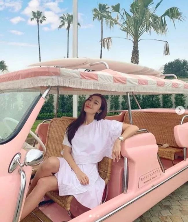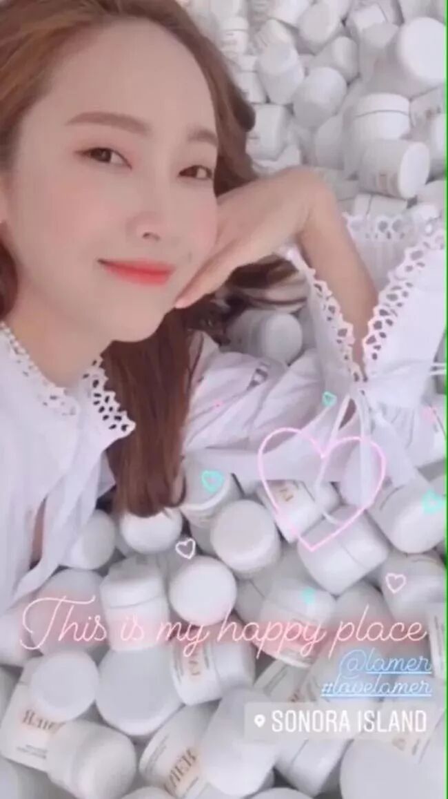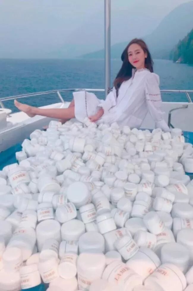 Jessica也因为这张照片上过热搜,她身处游艇内,坐在一堆白色罐子上面,小编定睛一看,天哪!这些罐子居然都是LA MER,还整整一船!