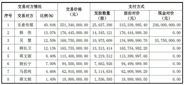 公告显示,长城影视将向乐意传媒支付2.36亿元的现金对价,此外还将发行2564万股以支付3.15亿元的股份对价。