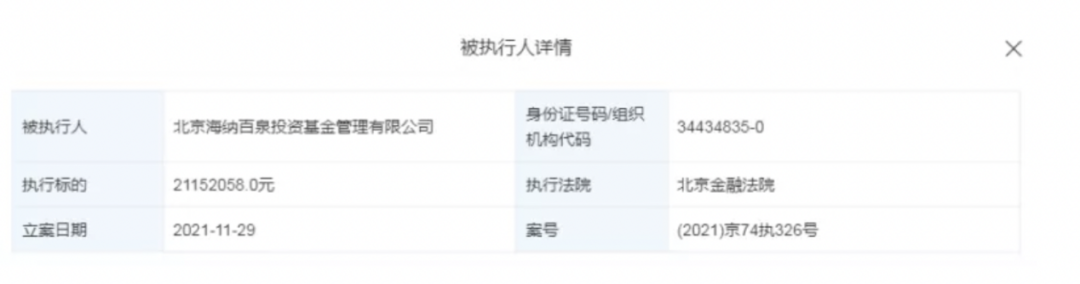 山雨欲来风满楼,一切风险都有前兆。去年12月2日,海纳百泉公司就被强制执行2115万。随后,胡海泉接受采访时解释称,他持股40%的北京海纳百泉投资基金管理有限公司曾发行一支文创类基金产品,融资方是做演唱会的,因2020年演出市场低迷导致回款延期。