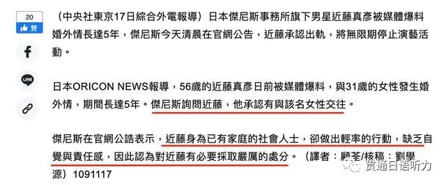 2020年11月17日,近藤真彦坦承出轨事实,并透过杰尼斯事务所发表声明,无限期停止所有演艺事业。