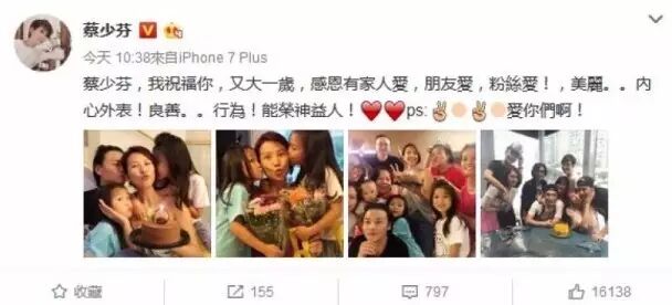 今日Ada就上载咗多张合照,见怇今次生日至少走咗两场,当中当然同老公张晋同埋两个女温馨贺生日,佢哋三个齐齐围住锡锡Ada,又送晒花同蛋糕,真系Sweet到爆!Ada又上载同好友庆生嘅相,星级老友包括朱茵、洪欣夫妇、陈法蓉等,见到佢哋面上嘅笑容就知个生日饭局有几开心啦!Ada留言:“蔡少芬,我祝福你,又大一岁,感恩有家人爱,朋友爱,粉丝爱!,美丽。。内心外表!良善。。行为!能荣神益人!️️ps:爱你们呀!”