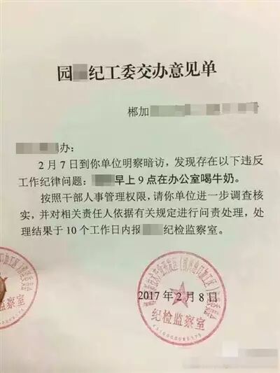 这张《园区纪工委交办意见单》上写着,“园区规划办:2月7日到你单位明察暗访,发现存在以下违反工作纪律问题:××早上9点在办公室喝牛奶。按照干部人事管理权限,请你单位进一步调查核实,并对相关责任人依据有关规定进行问责处理,处理结果于10个工作日内报园区纪检监察室”。底部加盖了郴州高新技术产业开发区(郴州出口加工区)管理委员会纪检监察室公章,落款时间为2月8日。