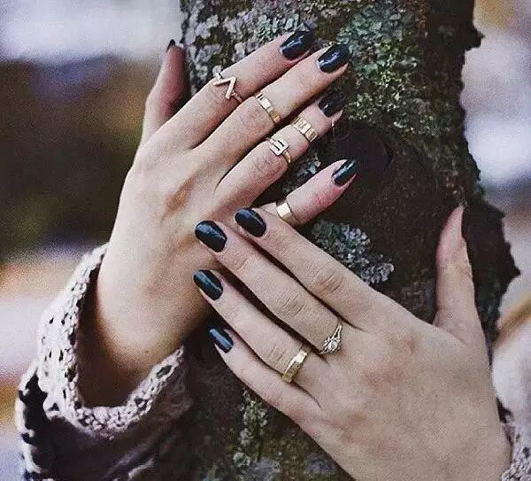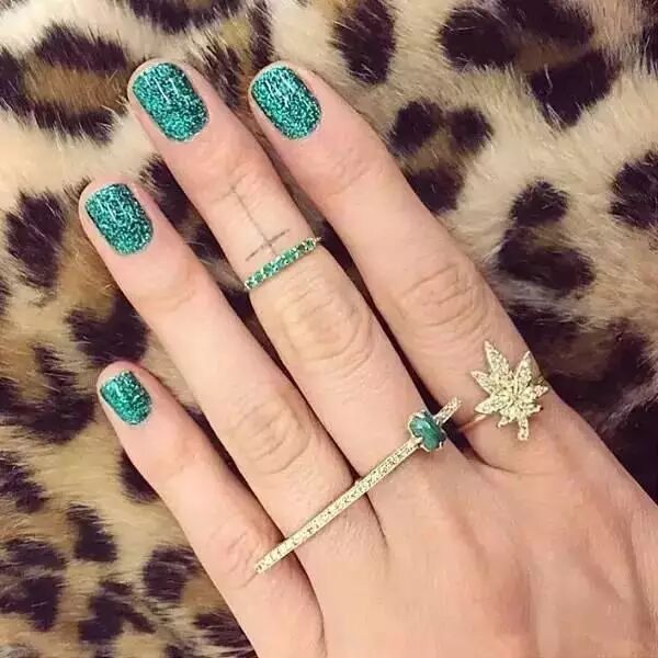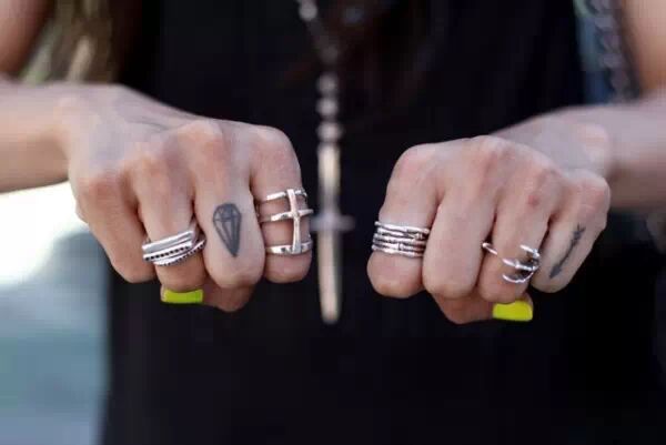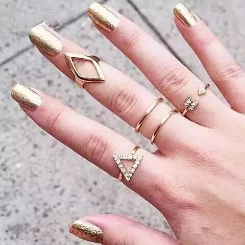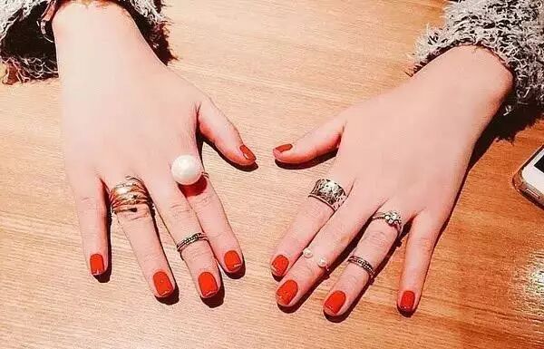同色的指甲和戒指叠戴在一起比较有系列感,有大有小最好有些图案的变化会显得更Fashion。佩戴位置是平行式。