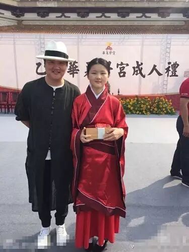 下面的照片中,孙楠女儿身穿红色汉服,头发盘起,端正的给父亲端茶,父女俩神似。