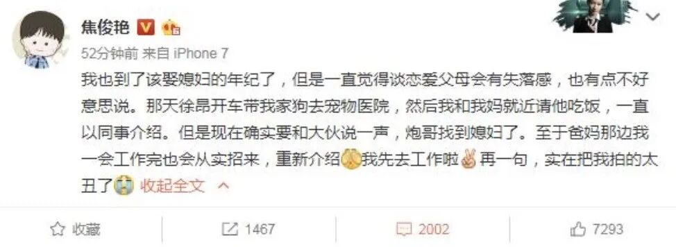 事后焦俊艳并没有隐瞒,而是在社交平台发文大方认爱,开心地表示:炮哥找到媳妇了。恋情曝光后二人十分低调,很少会合照秀恩爱。